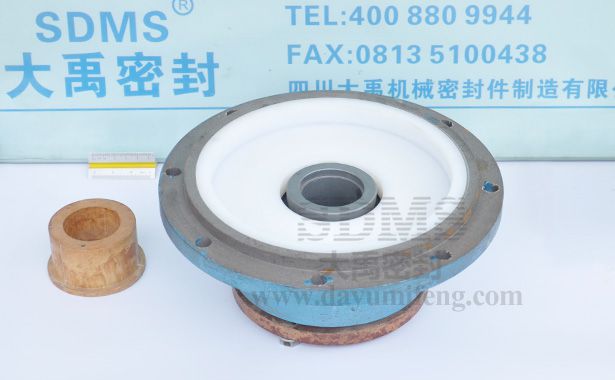 ? ? ? ?FUH型抗腐耐磨離心泵系懸臂離心泵。其軸封采用內裝式機械密封,采用外冷卻方式,需要加冷卻水,該密封的動、靜環由碳化硅制成;葉輪是采用聚乙烯工程塑料在壓制成型中嵌入金屬件制造而成的。拆卸后發現機械密封的動靜環密封面被嚴重磨損,甚至動靜環碎裂;有時葉輪的金屬件與葉輪母體脫落而導致葉輪失效。經分析是由于該公司鈷原料舍二氧化硅量大,據測定含二氧化硅52.4%-63.8%。渣液中含有大量的二氧化硅硬顆粒,微小顆粒進入機械密封面使密封磨損。隨著磨損量的增大,渣液中大硬顆粒也進入密封面,使機械密封面嚴重磨損,甚至動、靜環碎裂,致使軸封失效、泵泄漏。同時,因渣液含二氧化硅量大,渣液比重也大,使葉輪負荷大。導致葉輪母體穿入葉輪金屬件孔中的那部分工程塑料被剪切而斷裂,使葉輪金屬件與葉輪母體脫落,泵啟動后葉輪金屬件隨泵軸旋轉而葉輪母體卻不隨著旋轉,因而出現泵啟動后不出液的故障。? ? ? ??